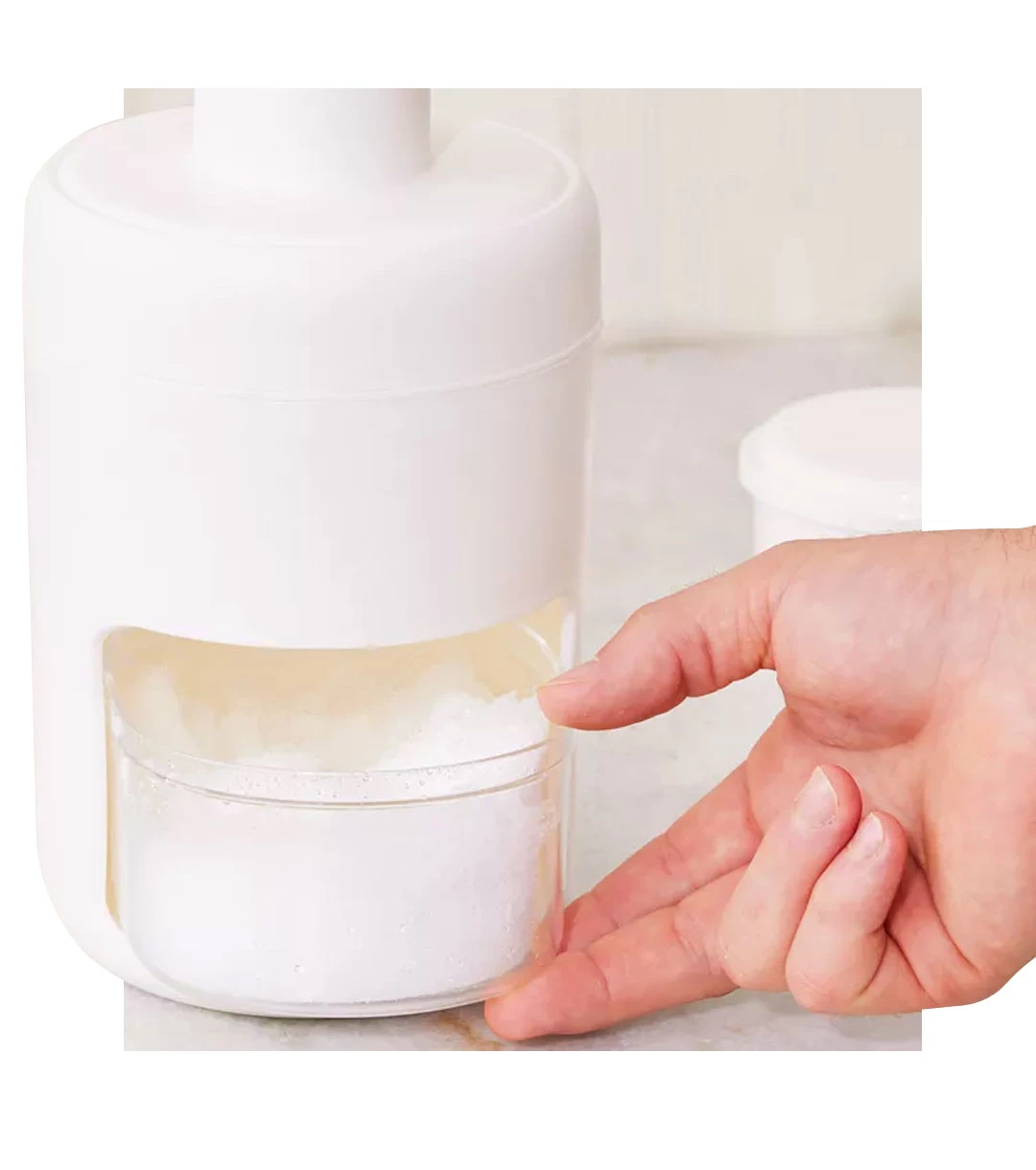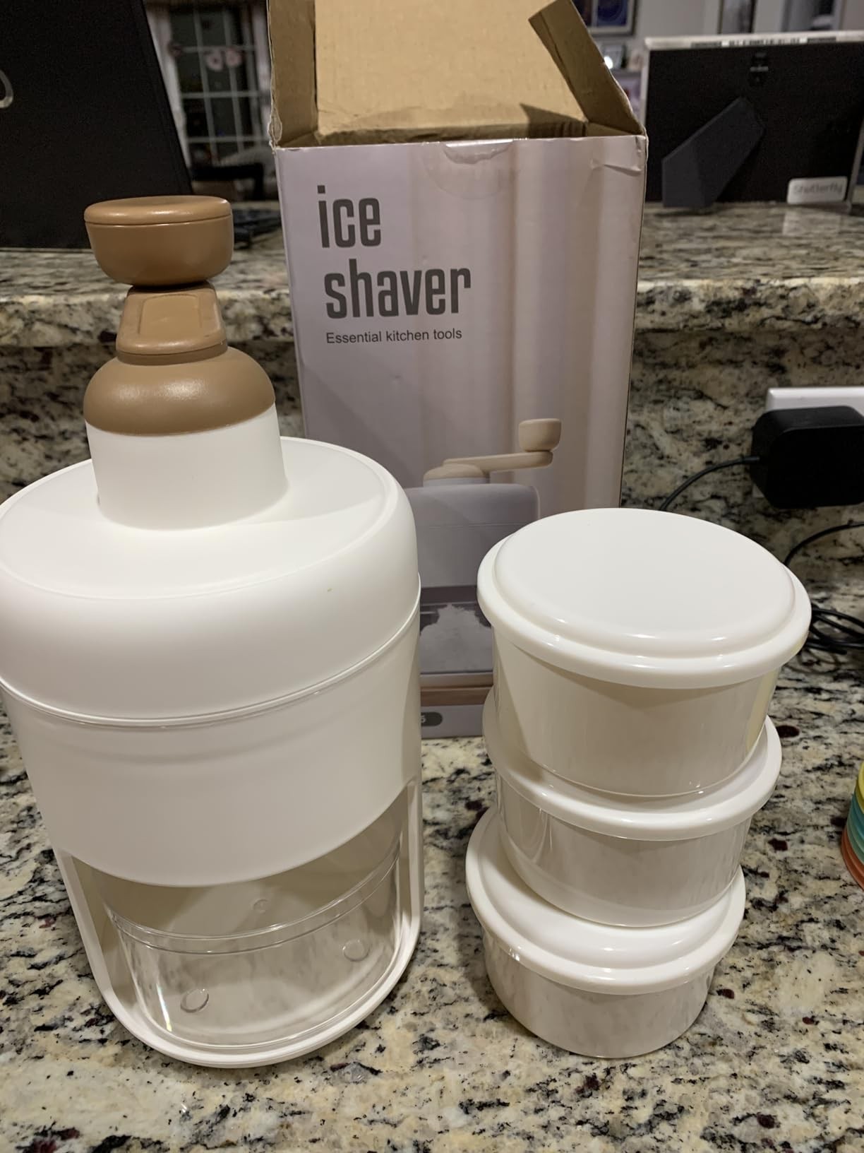الجهاز يتكون من ثلاثة أجزاء فقط: الجزء العلوي مع المقبض، والجزء الأوسط الذي يحتوي على الشفرة، والجزء السفلي لجمع الثلج المبشور. لاحظت أن استخدام قطعة ثلج كبيرة يعطي نتيجة أفضل من مكعبات الثلج الصغيرة التي تترك قطعًا أكبر. جربت صنع ثلج مبشور بالمانجو مع القليل من الشراب والحليب المكثف على الوجه وكانت النتيجة رائعة. الجهاز صغير الحجم، آليته بسيطة جدًا، وسهل الاستخدام حتى دون تعليمات مفصّلة.